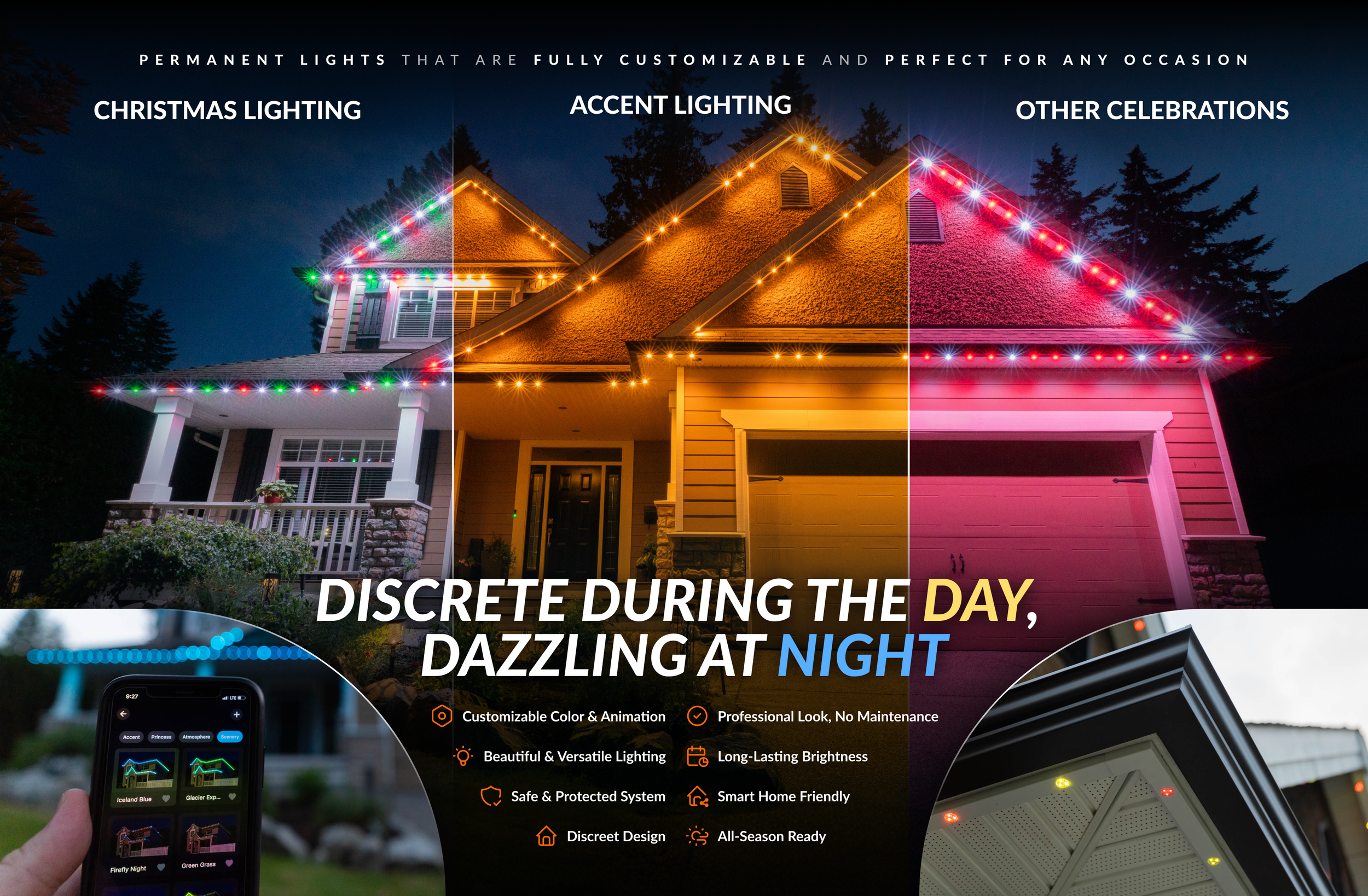 Our Glow package introduces permanent architectural lighting that enhances your home’s appearance year-round. Clean, professionally installed lighting along primary rooflines creates a warm, refined look while remaining subtle and elegant.